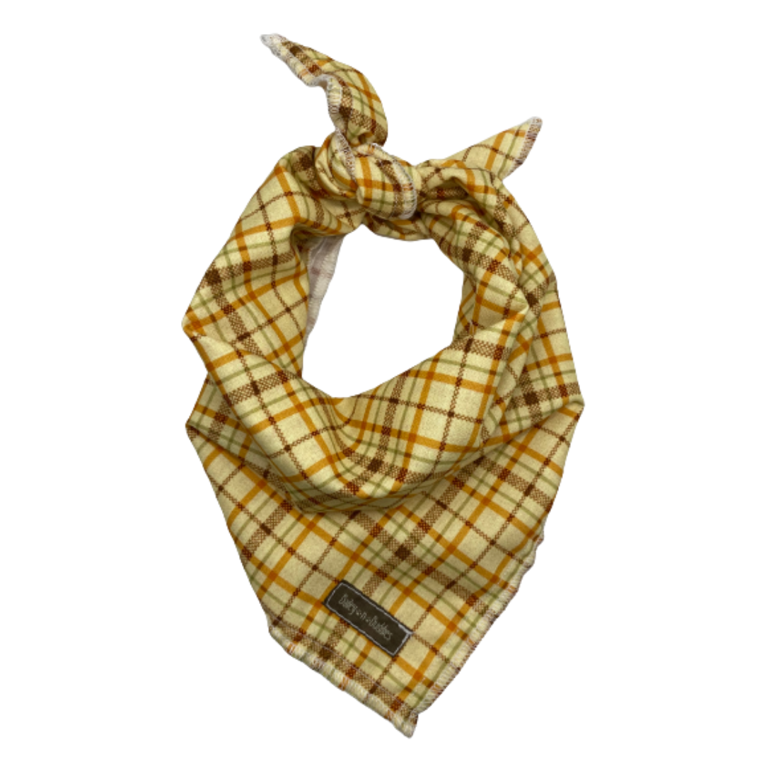 Bandana with an autumn plaid pattern. Comes unfolded so you may adjust to desired size. Available in Small, Medium, and Large. Select size to see pricing.