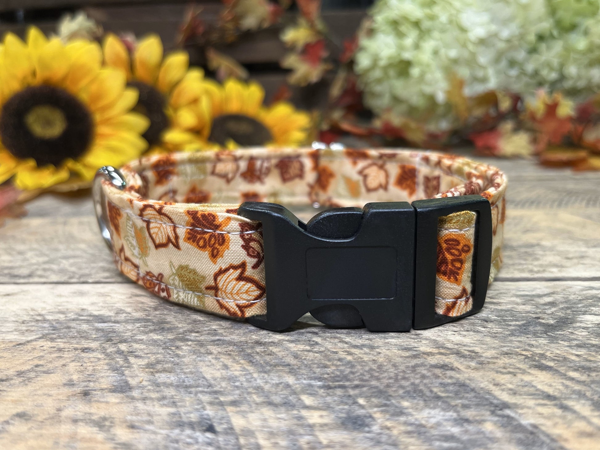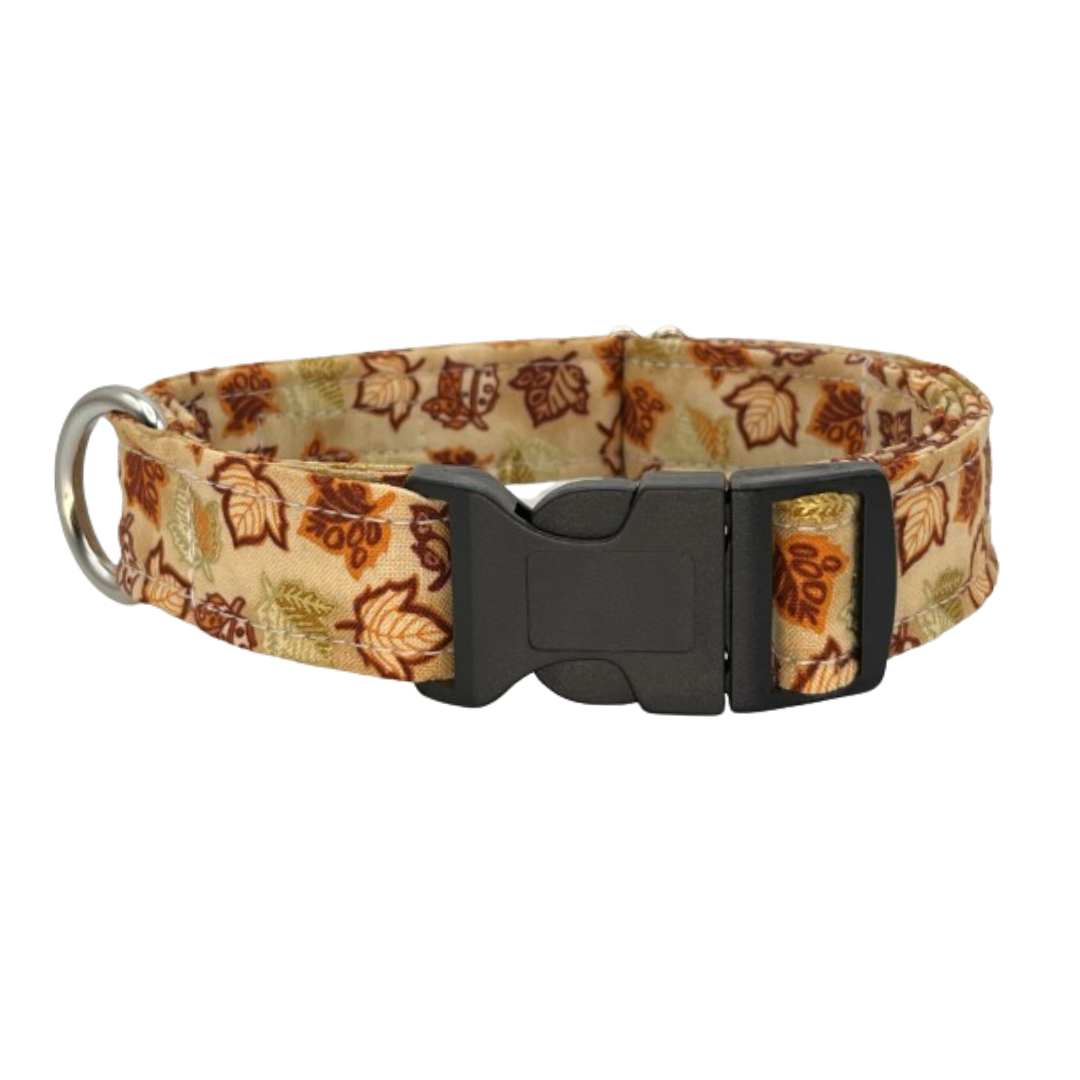 Dog Collar with an autumn leaf pattern. Available in Extra Small, Small, Medium, and Large with choice of buckle type. Select size to see pricing.