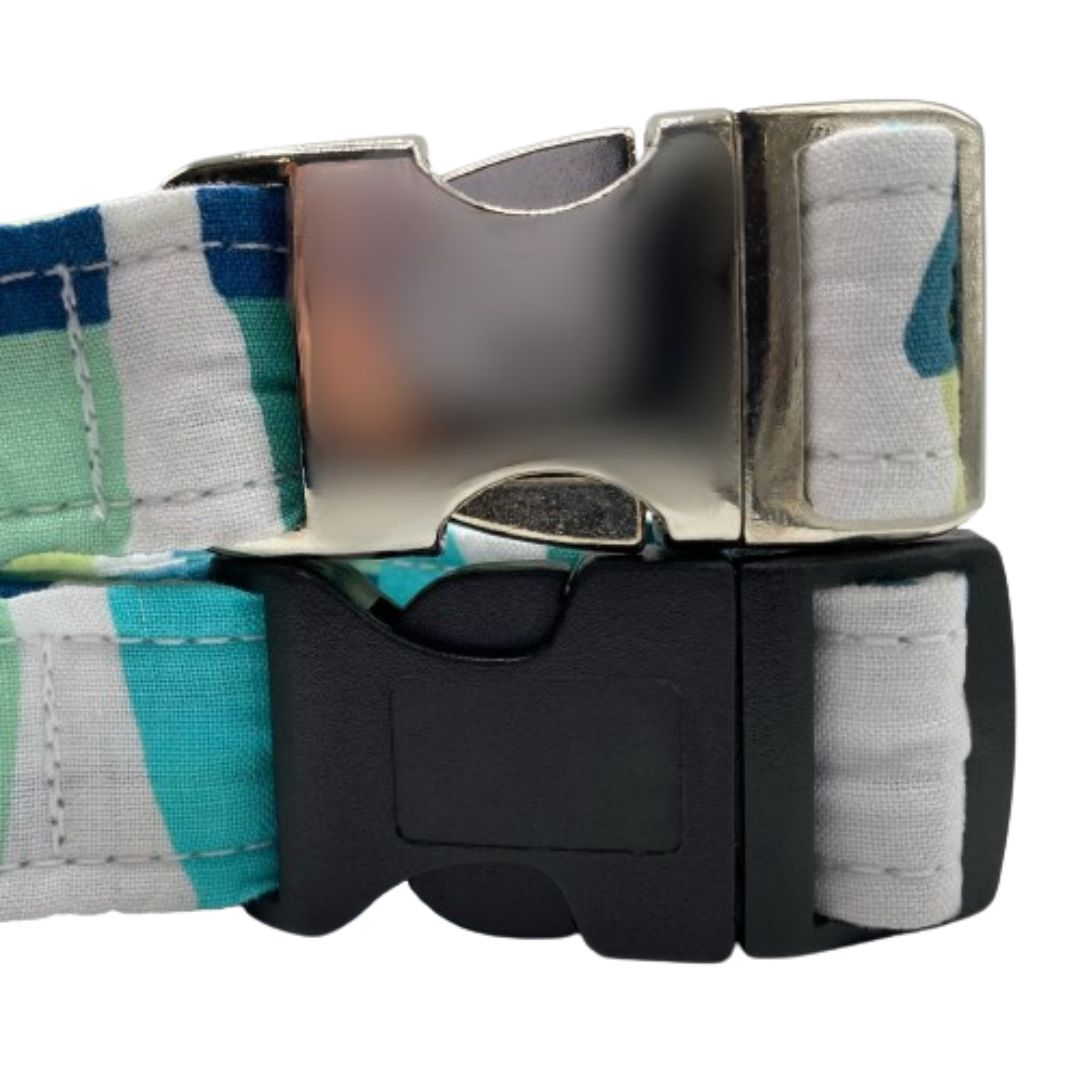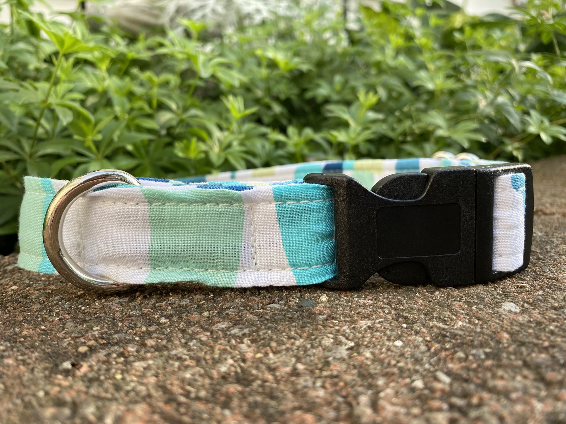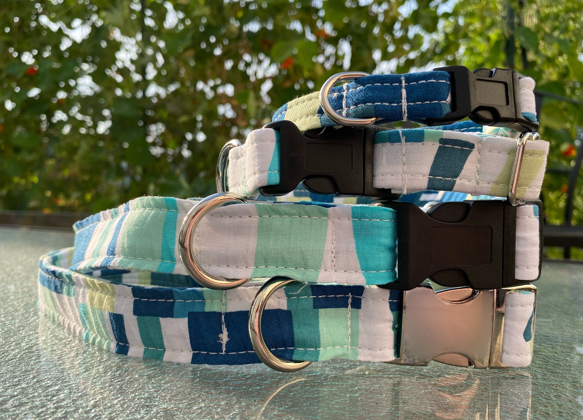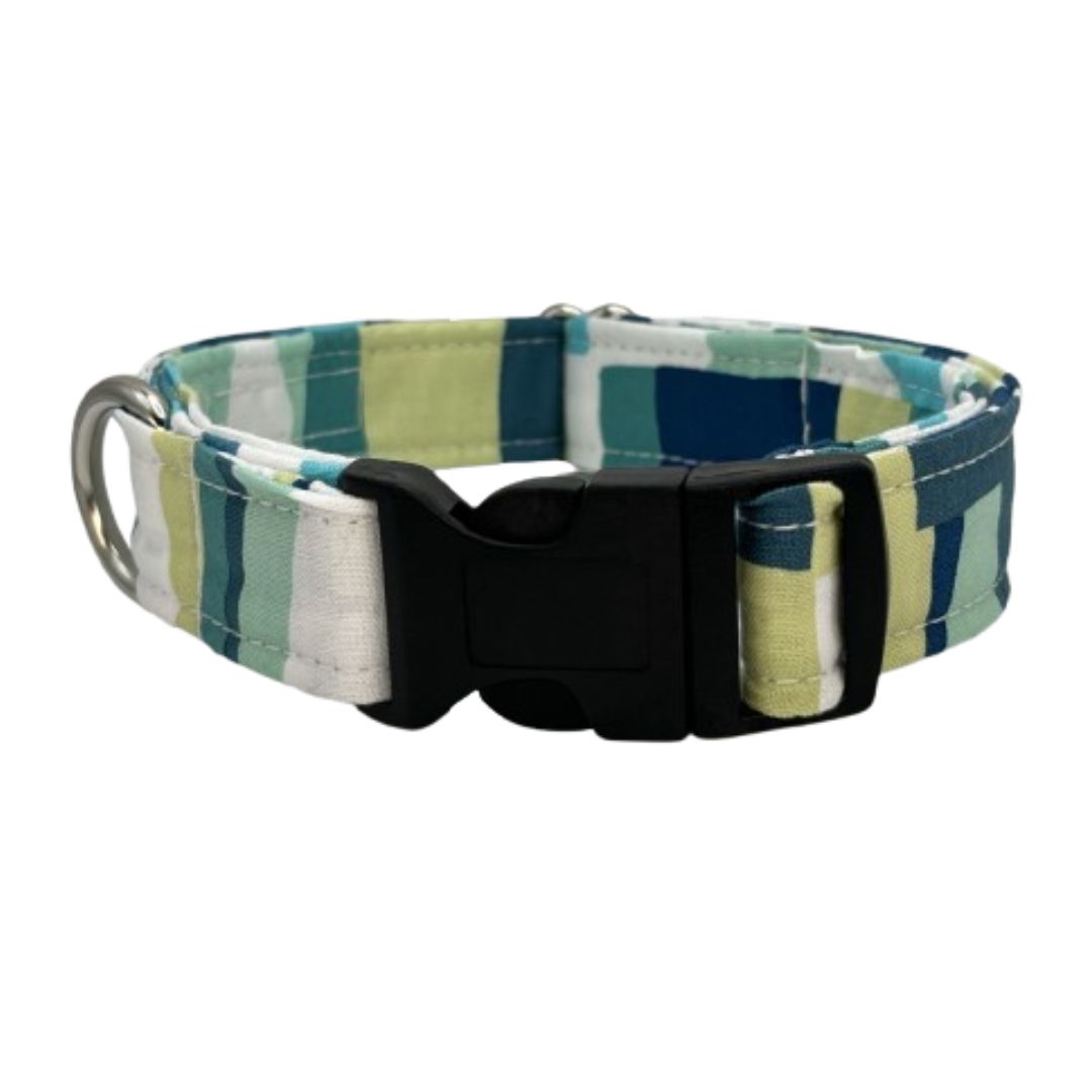 Dog Collar with blue, green, and white "Bauhaus Blocks" pattern. Available in Extra Small, Small, Medium, and Large with choice of buckle type. Select size to see pricing.