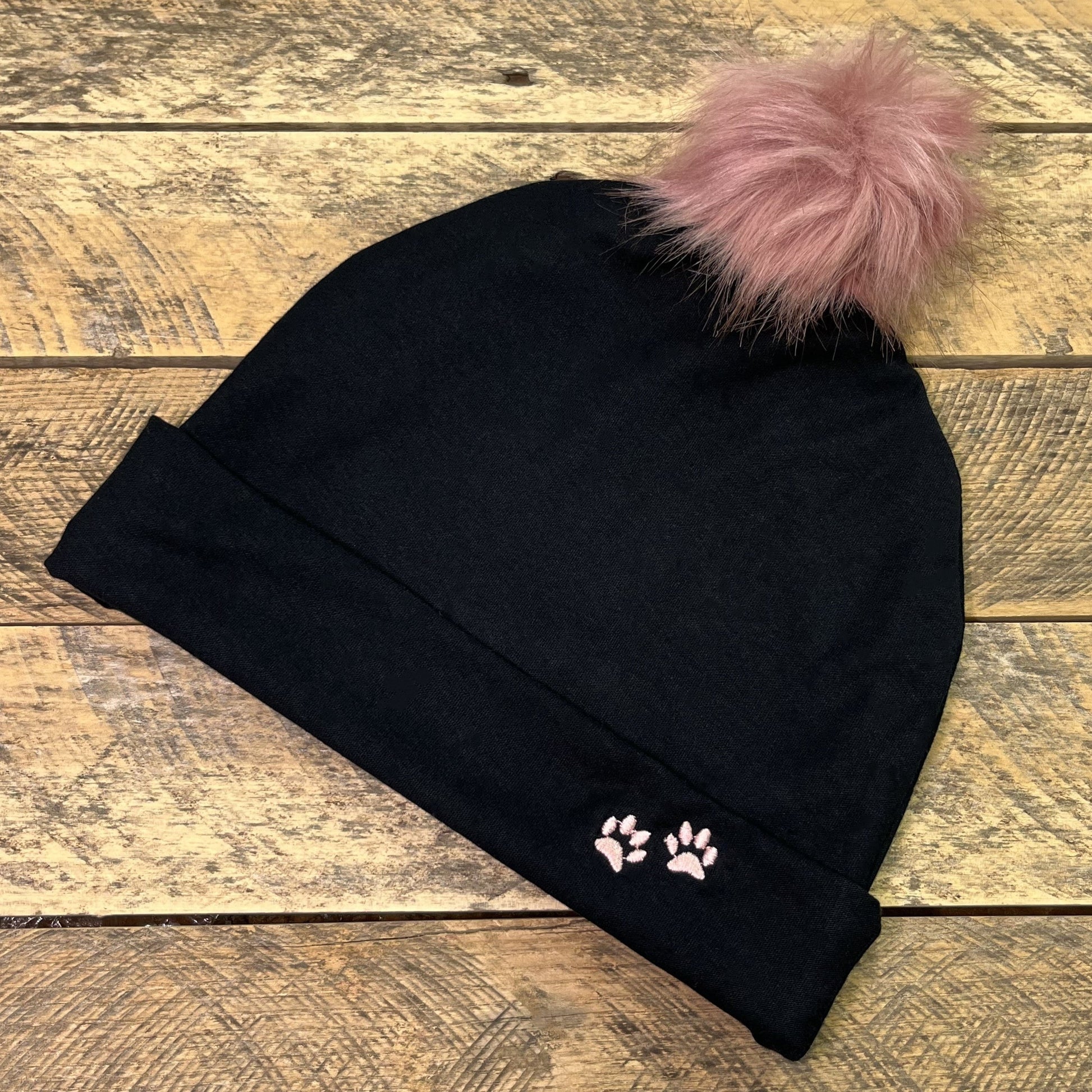 Stay warm this season with our black cotton knit winter hat. Comes in three sizes: Women's, Girls, and Boys. All hats are adorned with Bailey n Buddies paw prints.