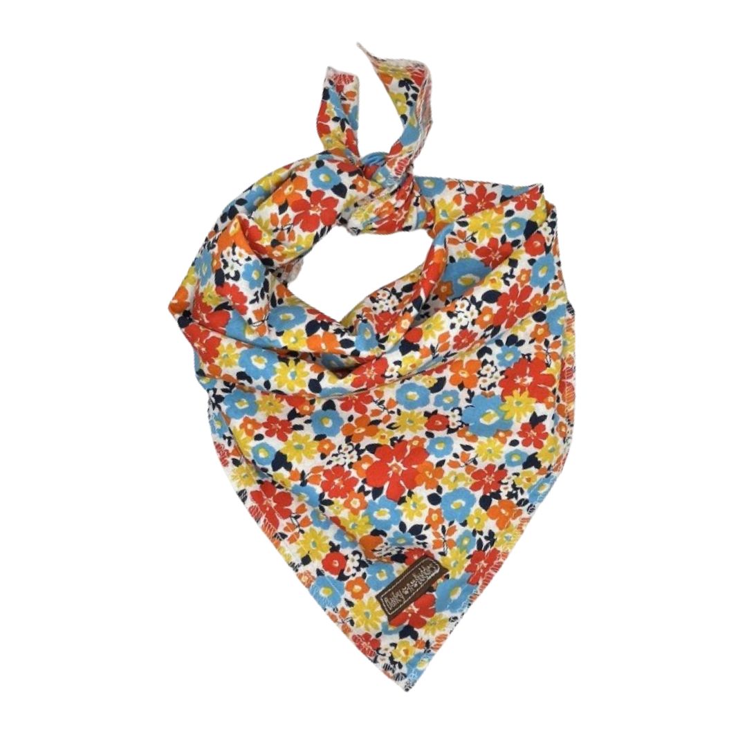 Bandana with bright floral pattern. Comes unfolded so you may adjust to desired size. Available in Small, Medium, and Large. Select size to see pricing.