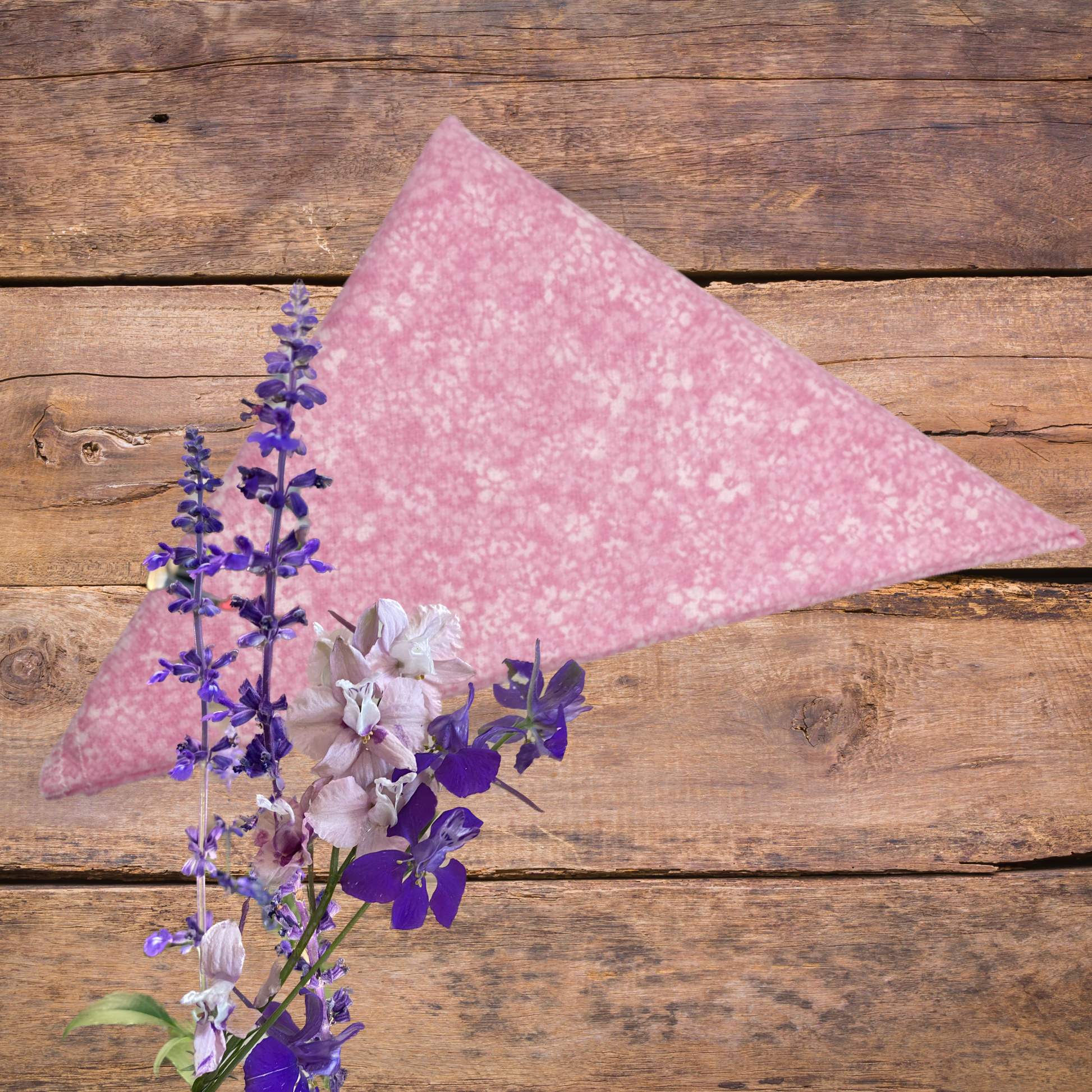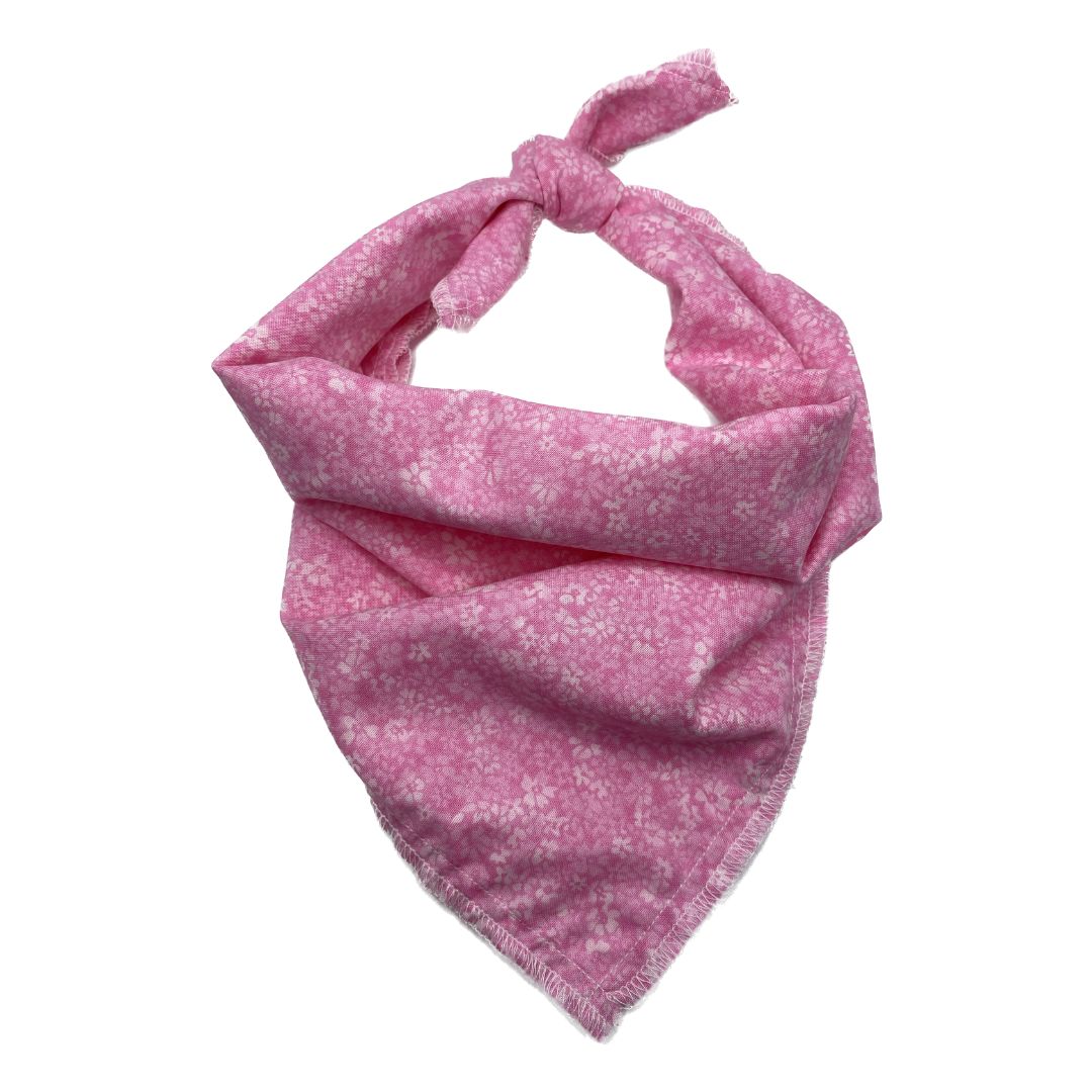 Bandana with pink "Confetti Floral" pattern. Comes unfolded so you may adjust to desired size. Available in Small, Medium, and Large. Select size to see pricing.
