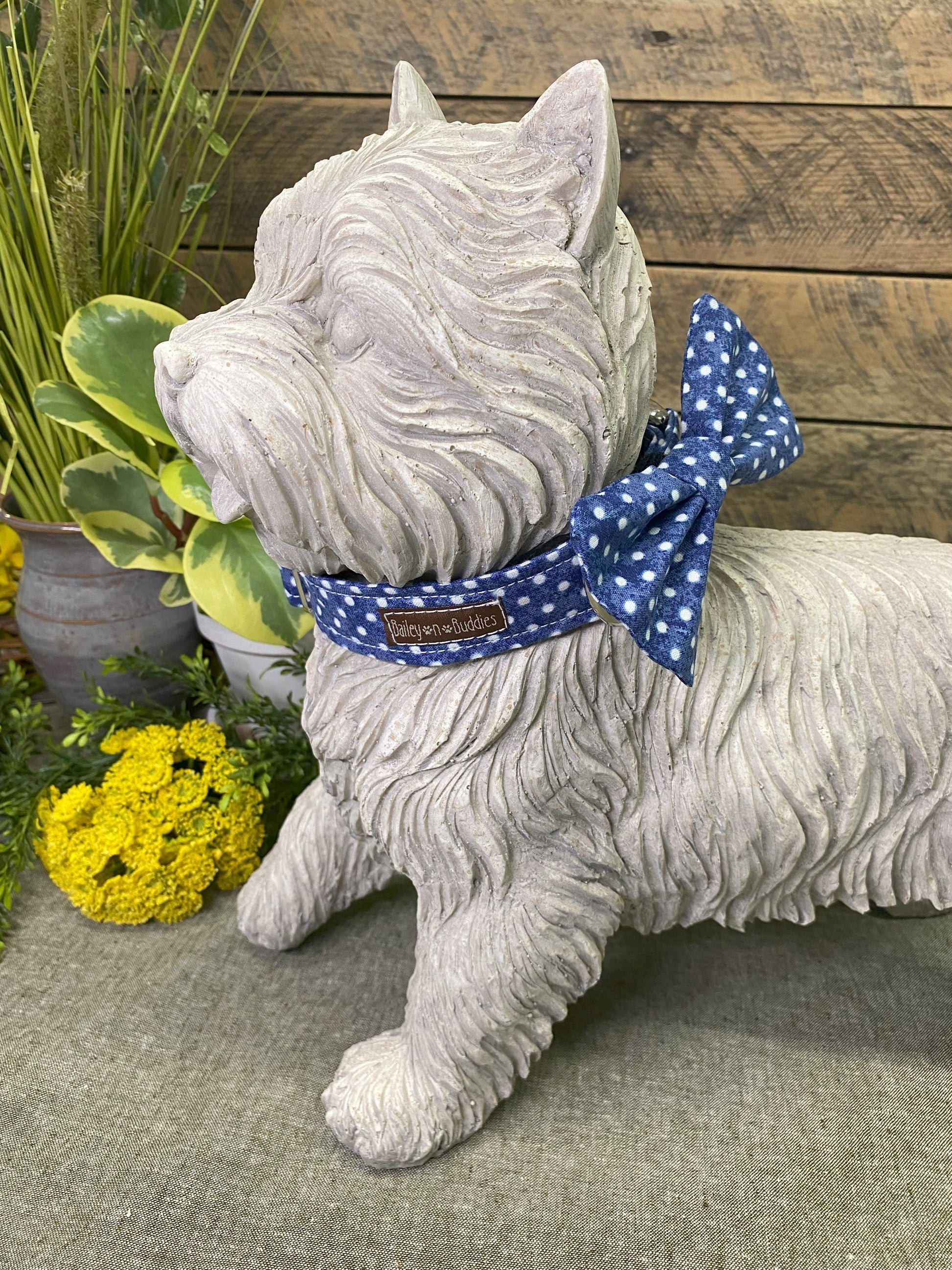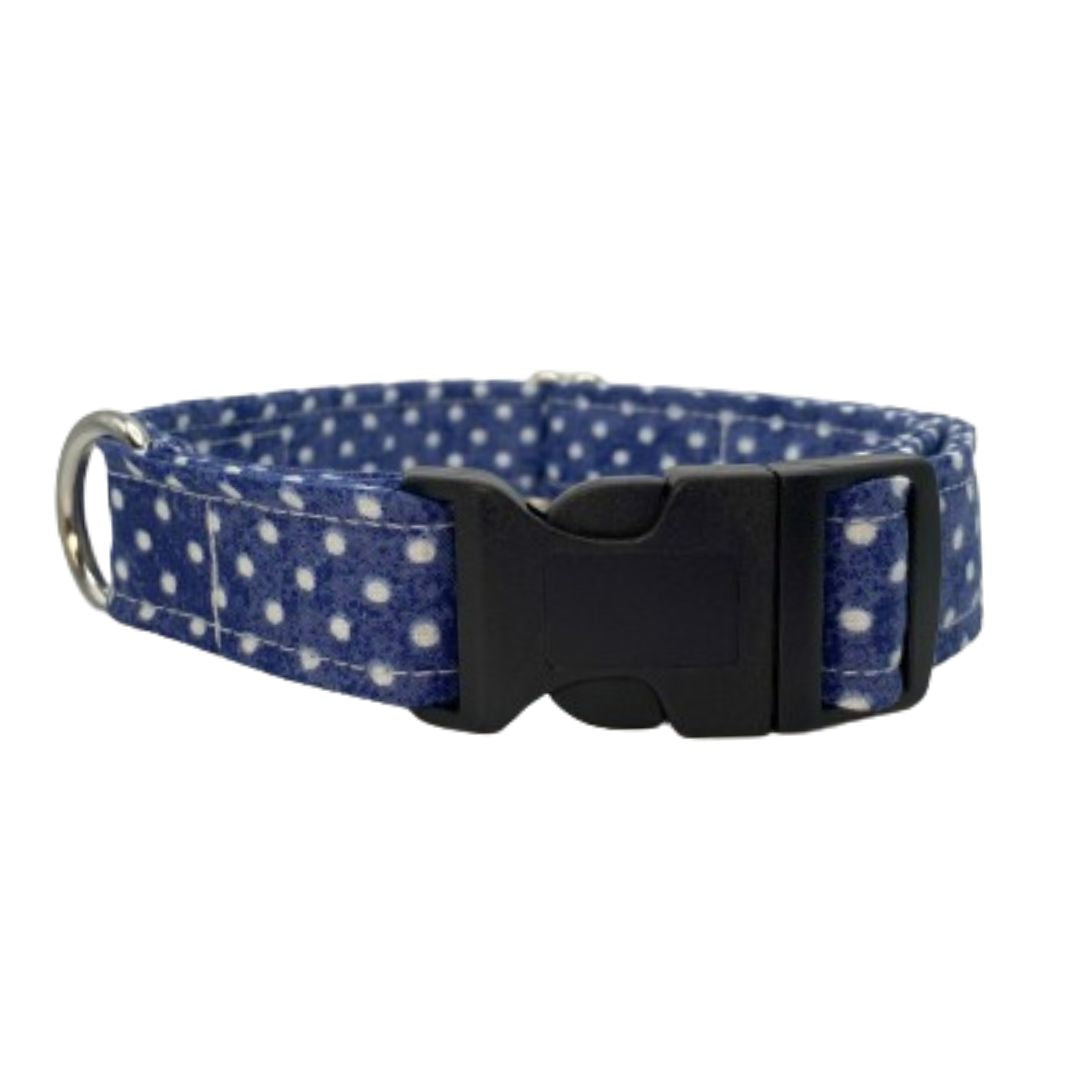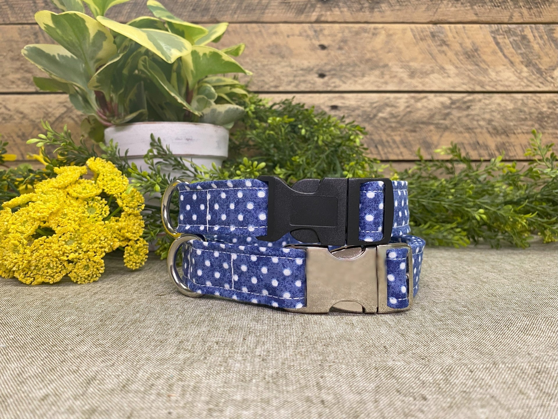 Dog Collar with a denim blue polka dot pattern. Available in Extra Small, Small, Medium, and Large with choice of buckle type. Select size to see pricing.