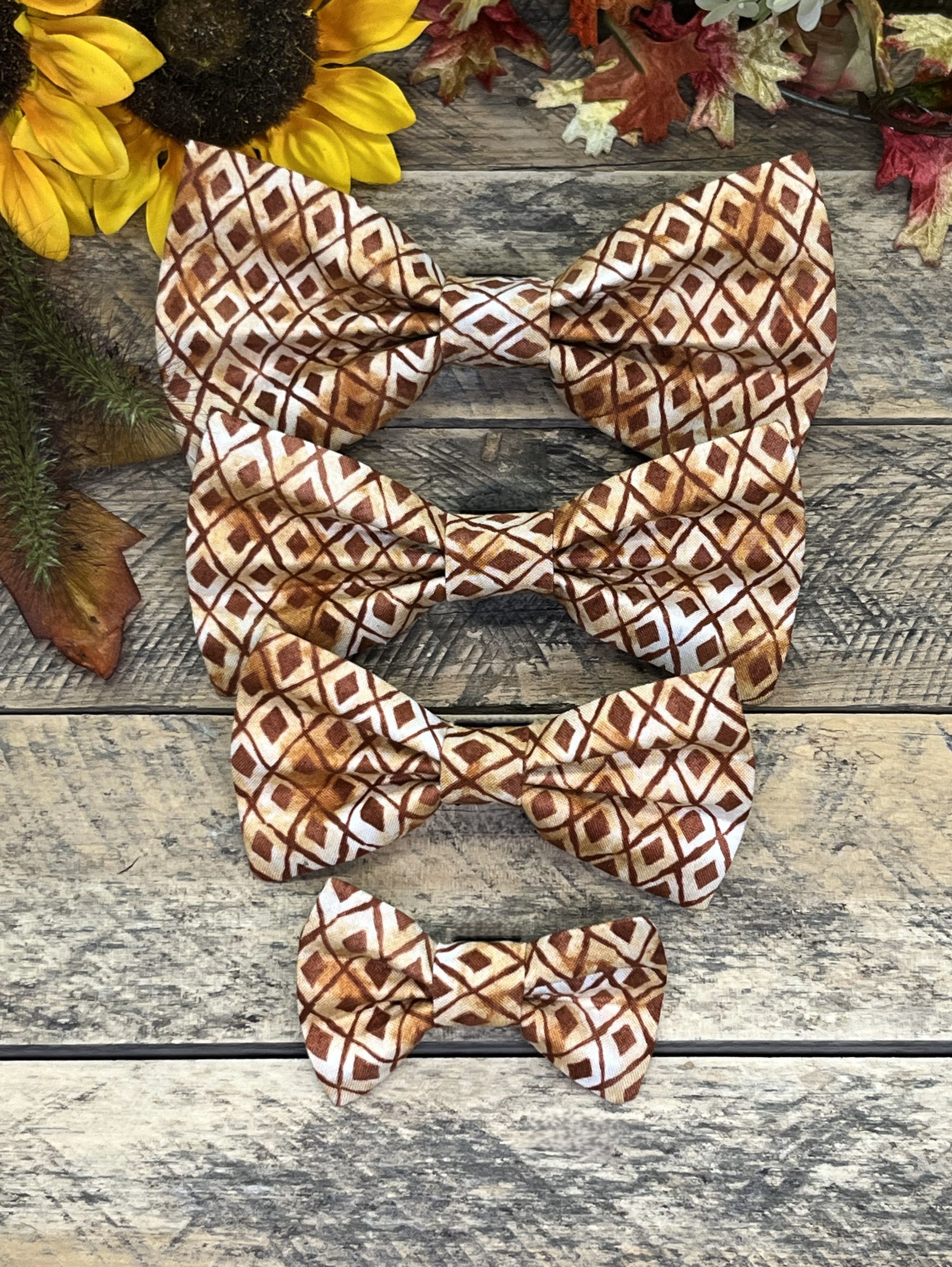 Equipped with a velcro strap, these bow ties are adorable add-ons to your pup's collar! They come in Extra Small, Small, Medium, and Large.