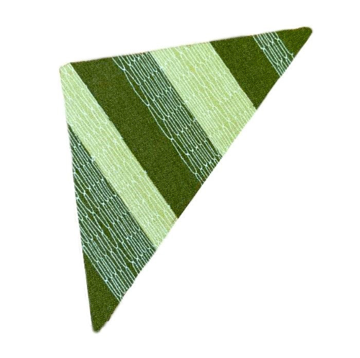 Bandana with a green striped pattern. Comes unfolded so you may adjust to desired size. Available in Small, Medium, and Large. Select size to see pricing.