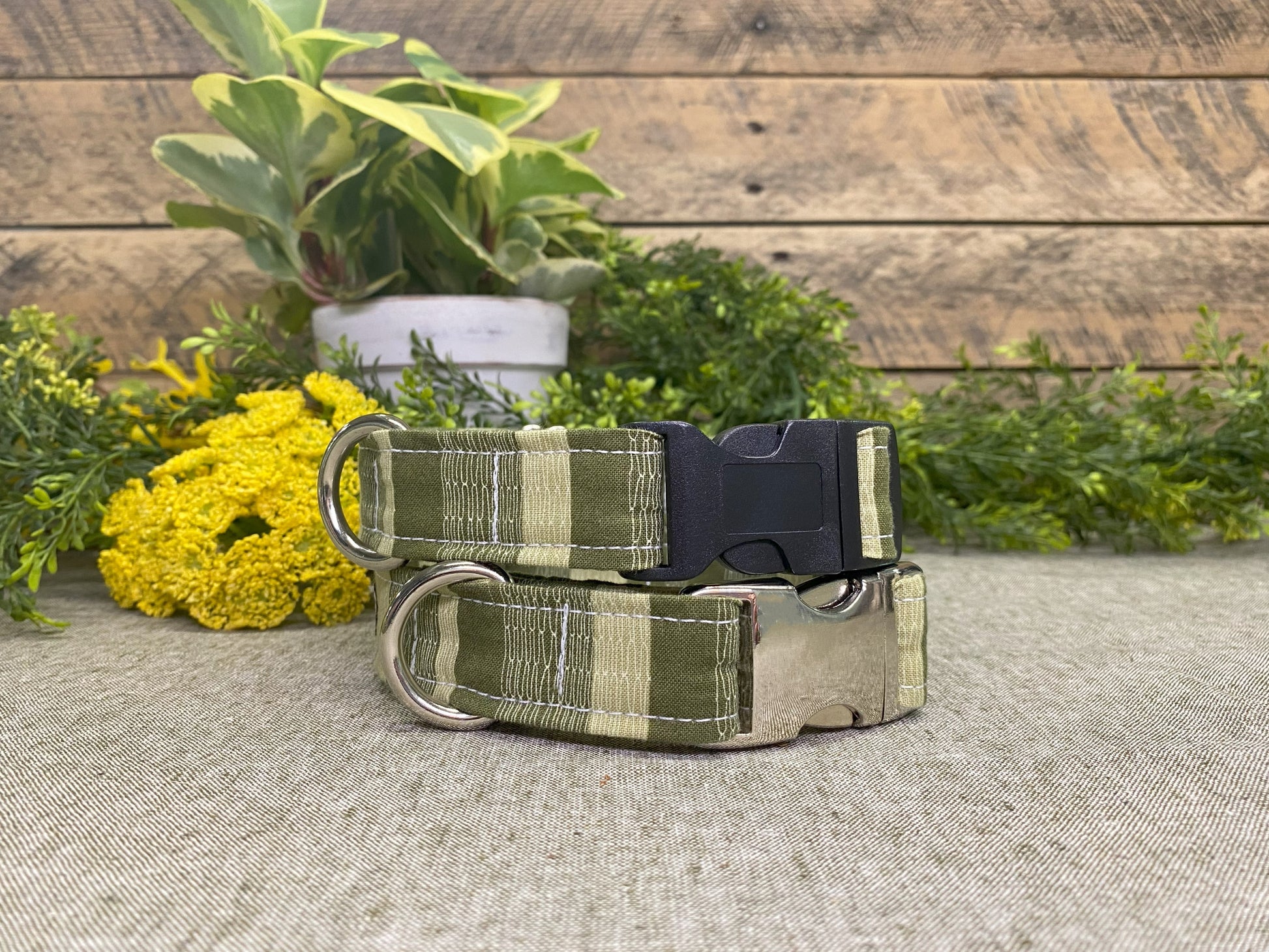 Dog Collar with a green striped pattern. Available in Extra Small, Small, Medium, and Large with choice of buckle type. Select size to see pricing.