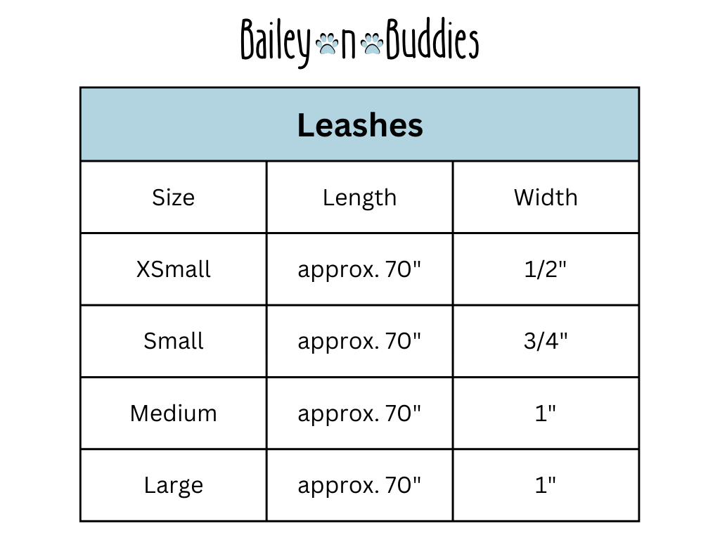 These fun-patterned, sturdy leashes have a secure clasp and pair perfectly with your dog's collar. All leashes are approximately 70" long, but vary in width depending on selected size.
