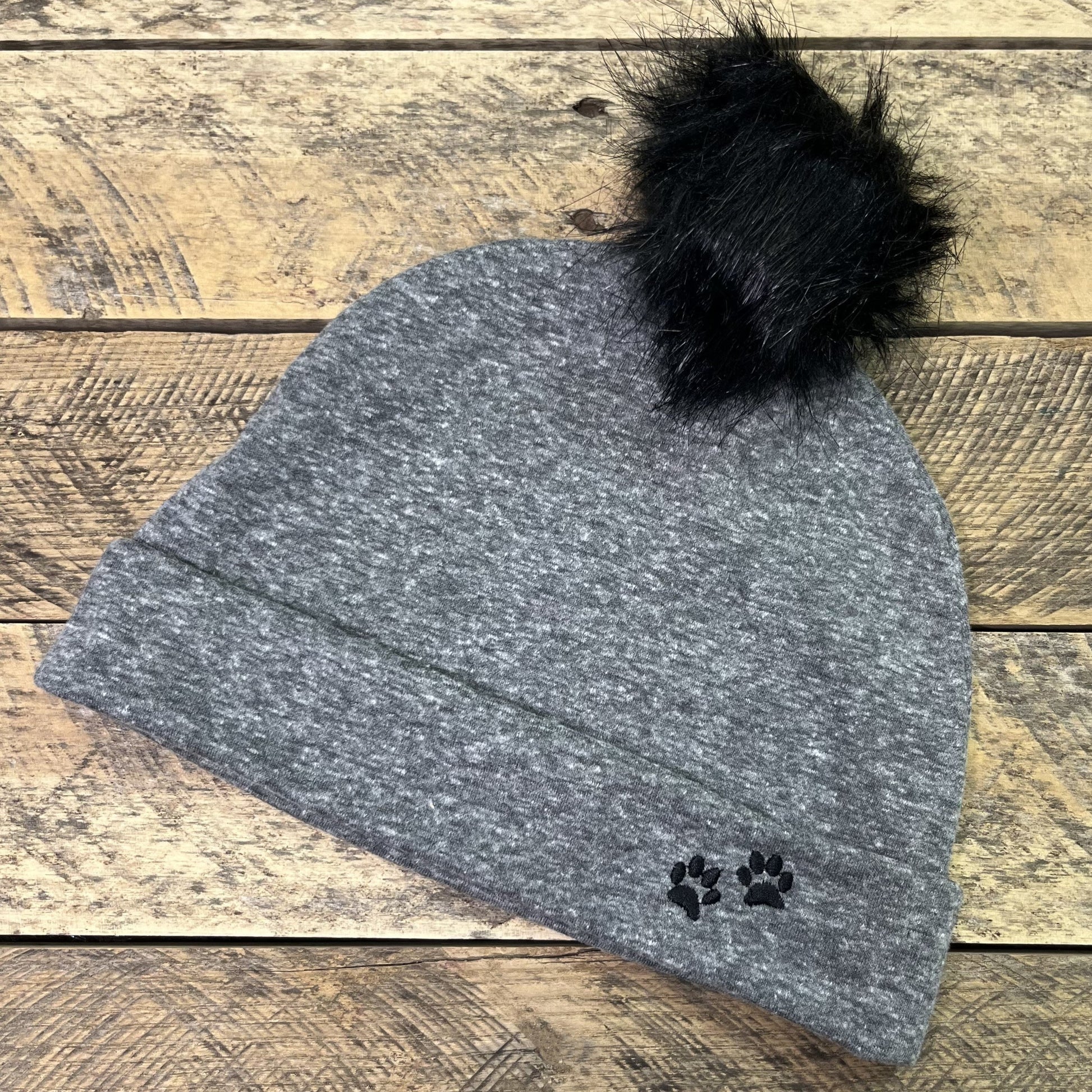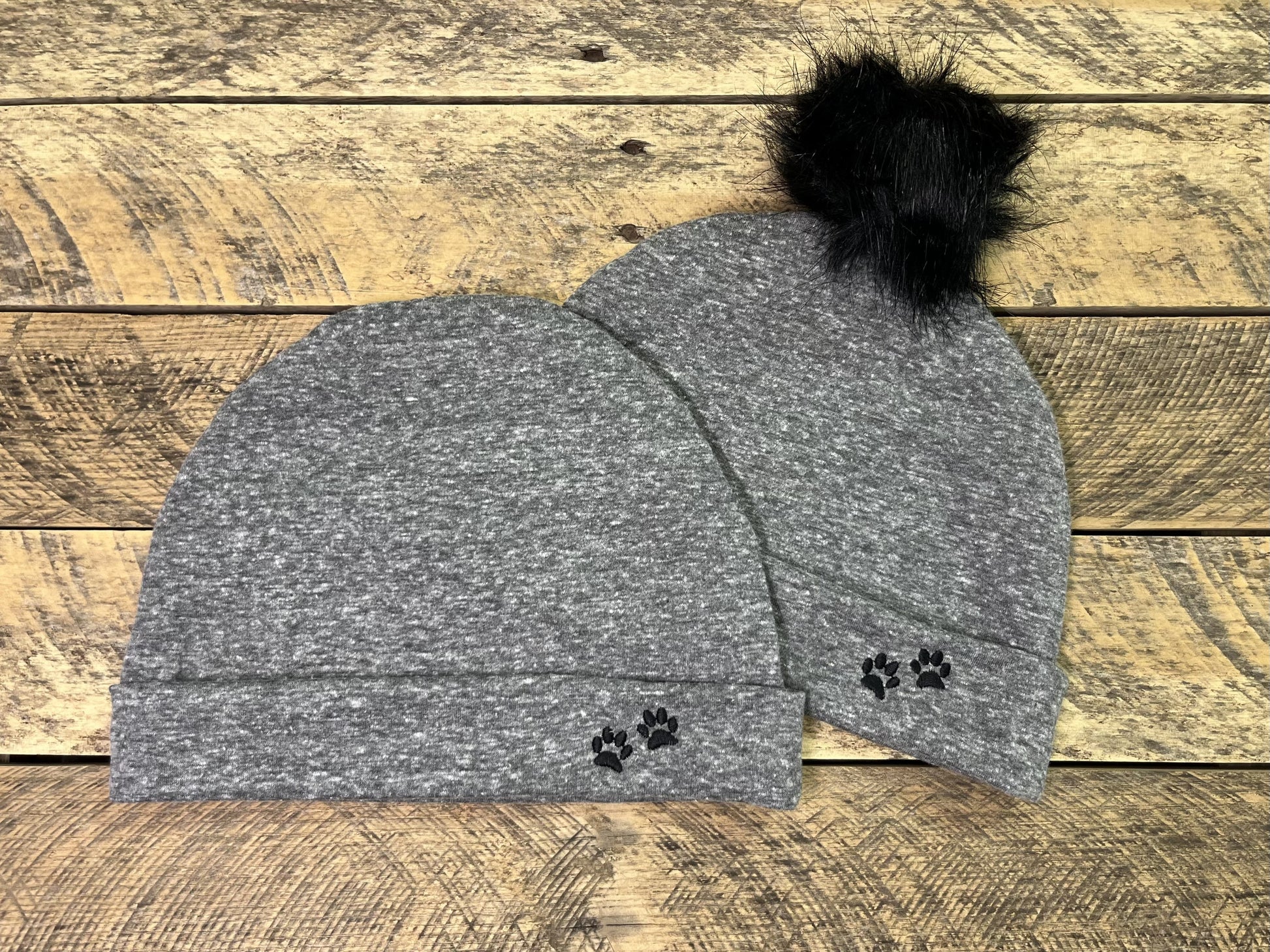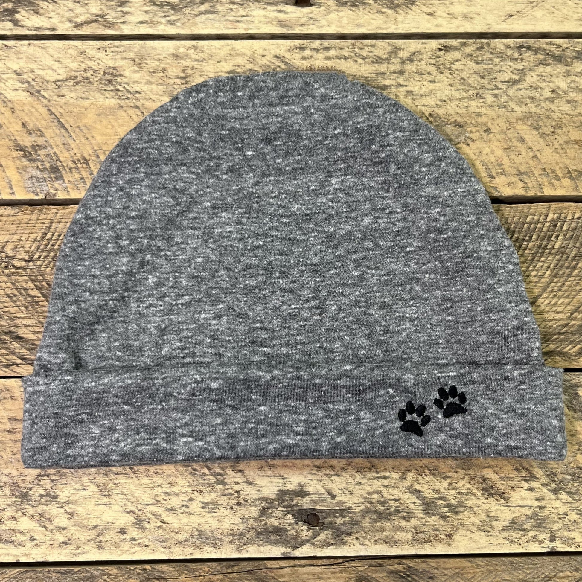 Stay warm this season with our gray cotton knit winter hat. Comes in three sizes: Women's, Girls, and Boys. All hats are adorned with Bailey n Buddies paw prints.