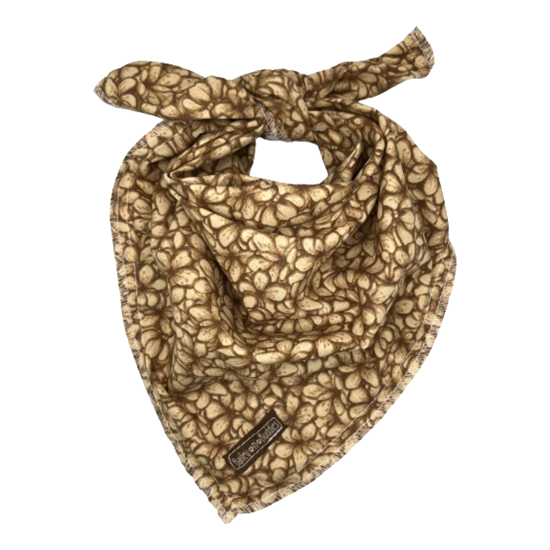 Bandana with a mocha-colored floral pattern. Comes unfolded so you may adjust to desired size. Available in Small, Medium, and Large. Select size to see pricing.