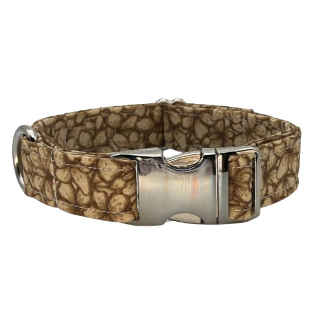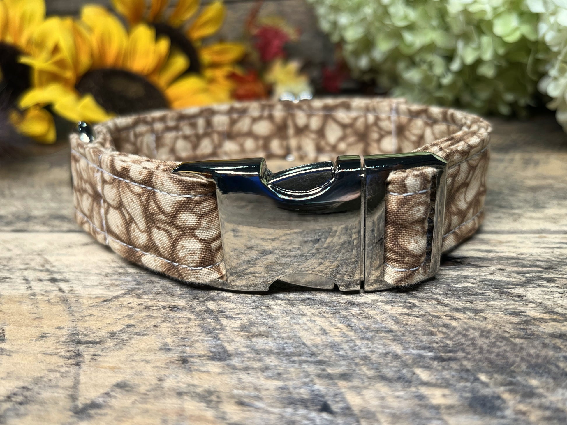 Dog Collar with mocha-colored floral pattern. Available in Extra Small, Small, Medium, and Large with choice of buckle type. Select size to see pricing.