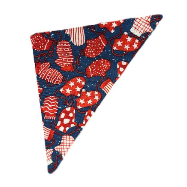 Bandana with red and blue mitten pattern. Comes unfolded so you may adjust to desired size. Available in Small, Medium, and Large. Select size to see pricing.