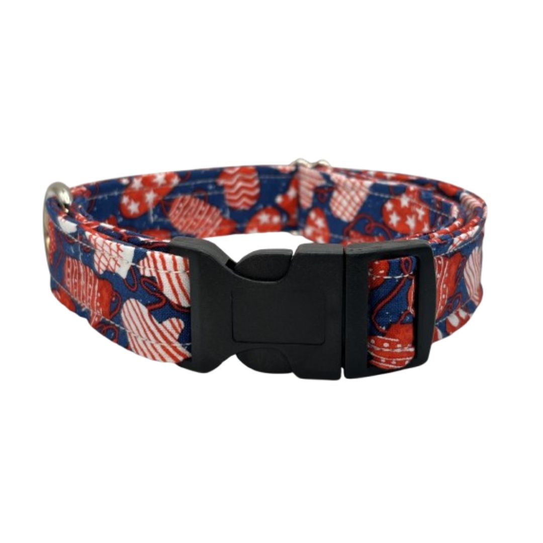 Dog Collar with red and blue mitten pattern. Available in Extra Small, Small, Medium, and Large with choice of buckle type. Select size to see pricing.