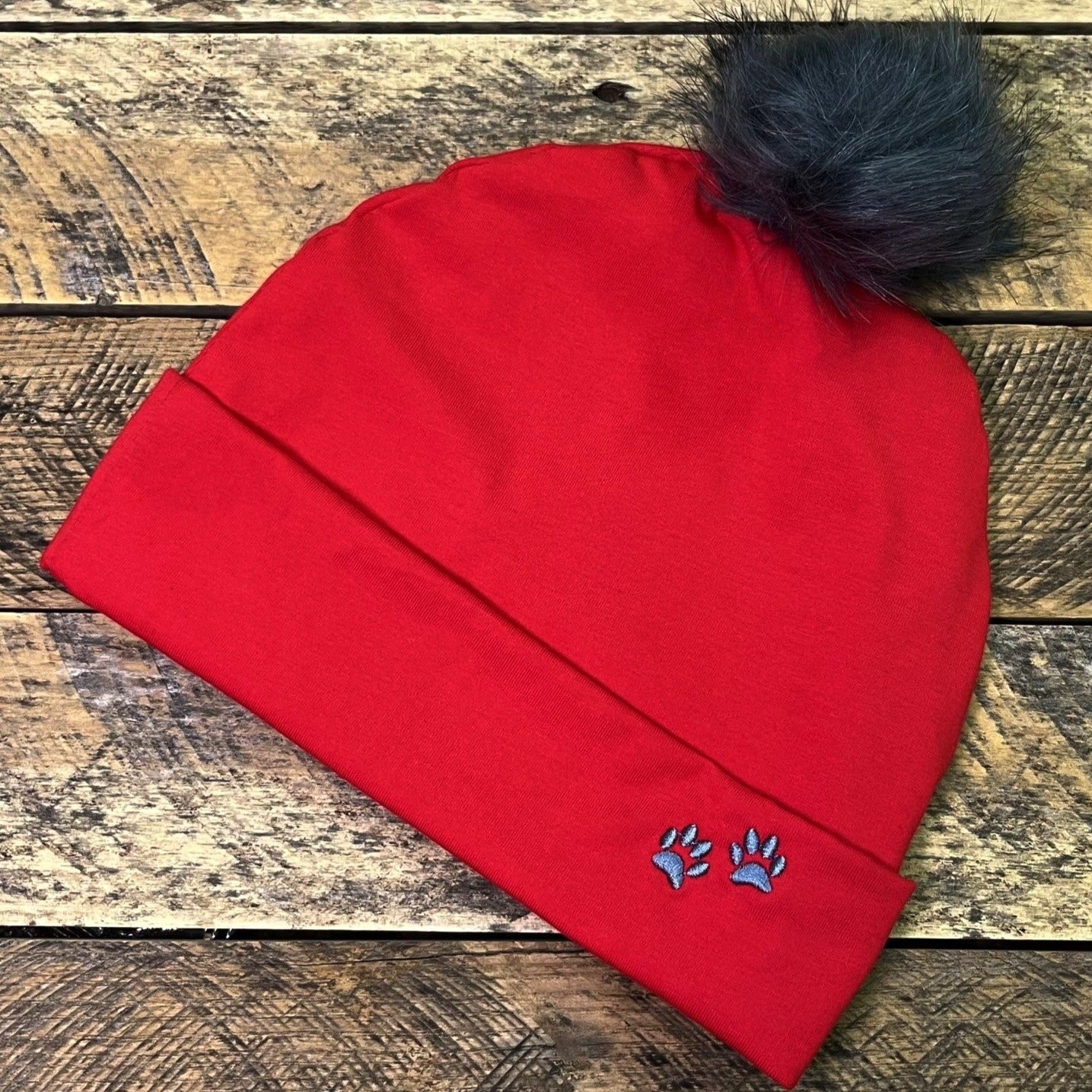 Stay warm this season with our red cotton knit winter hat. Comes in three sizes: Women's, Girls, and Boys. All hats are adorned with Bailey n Buddies paw prints.