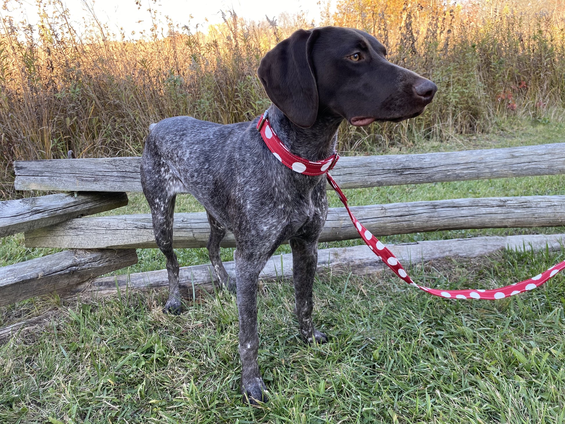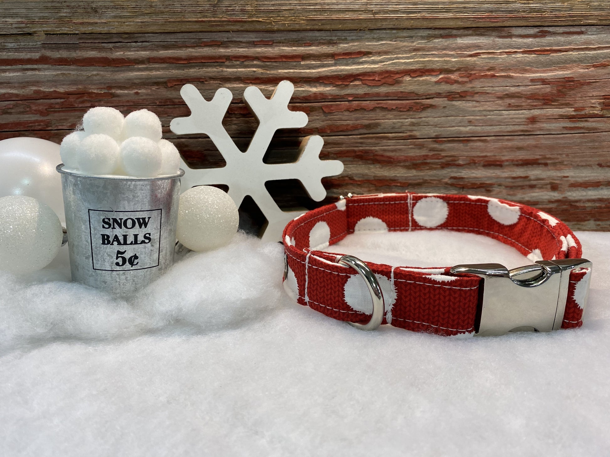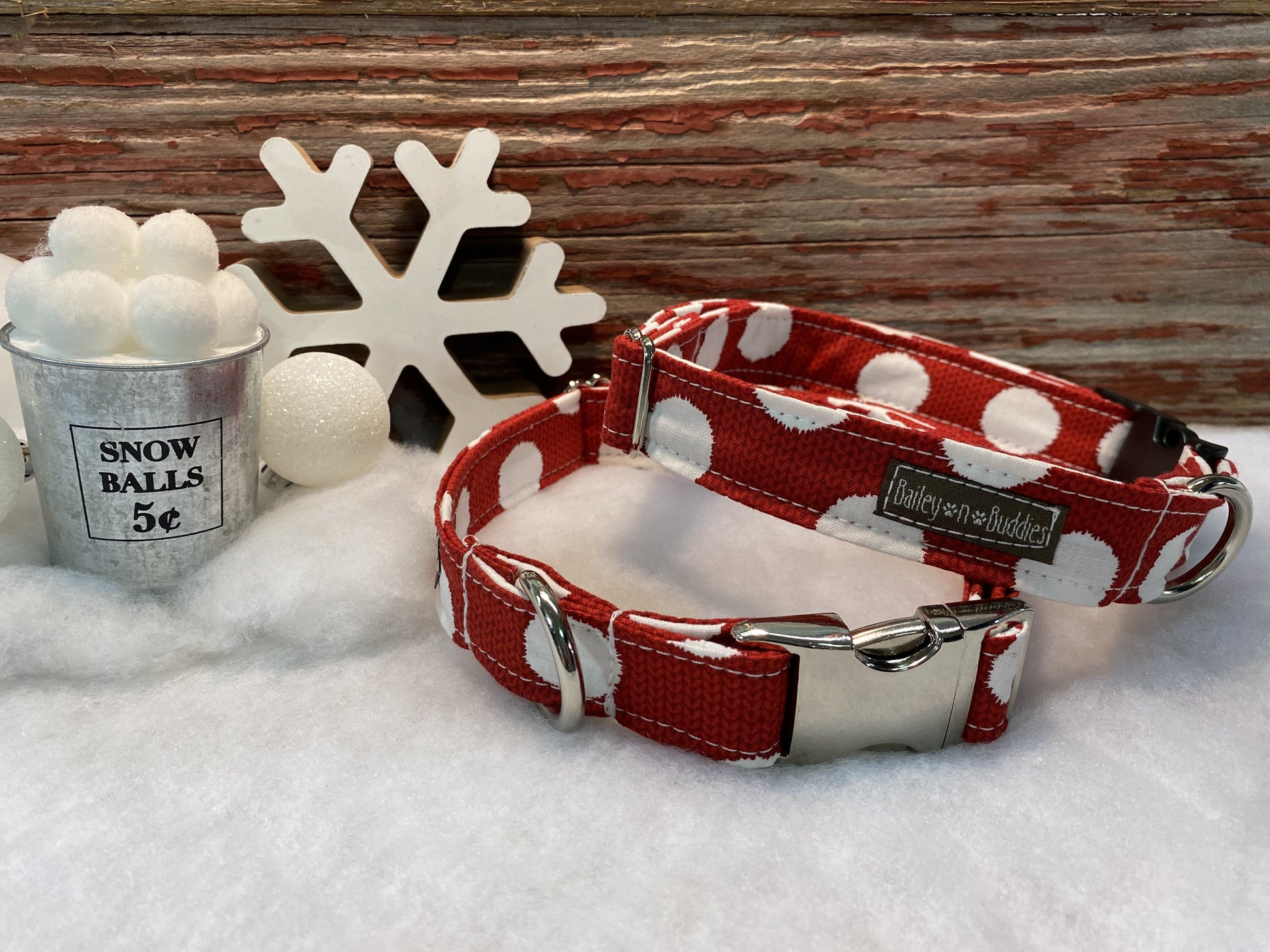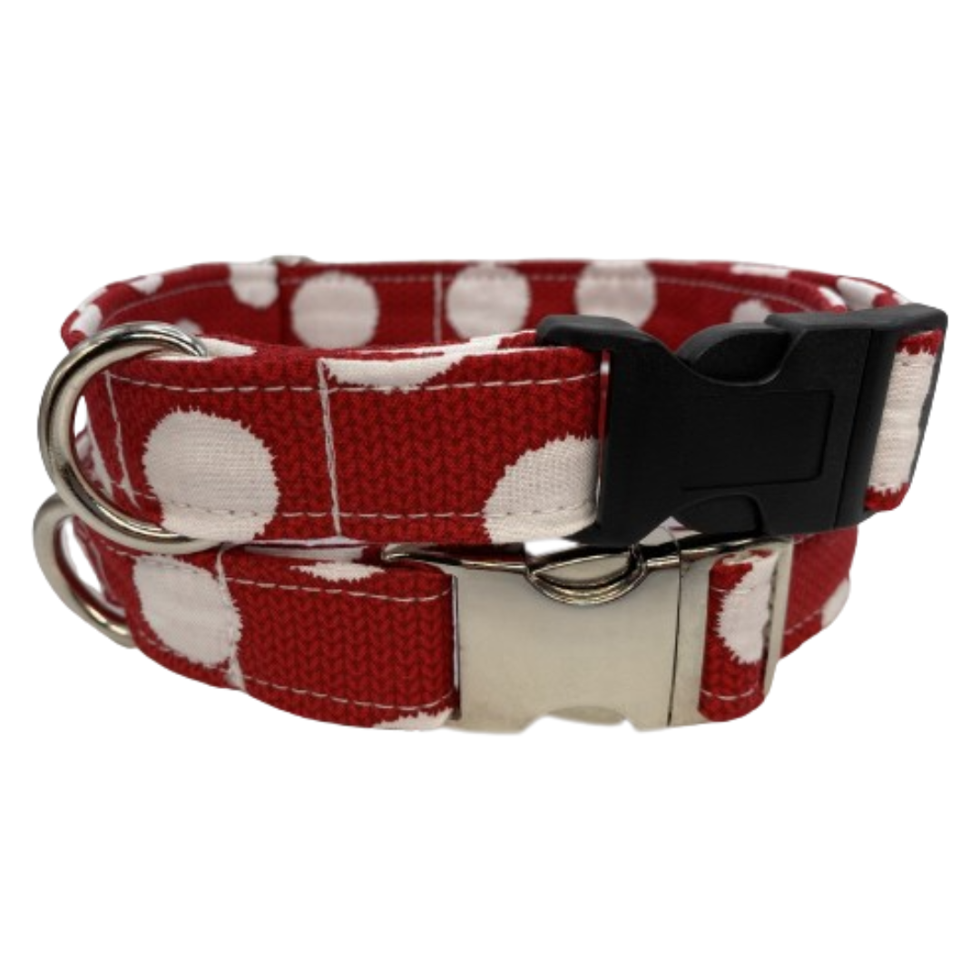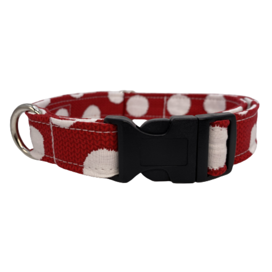 Dog Collar with an adorable red and white pattern. Available in Extra Small, Small, Medium, and Large with choice of buckle type. Select size to see pricing.