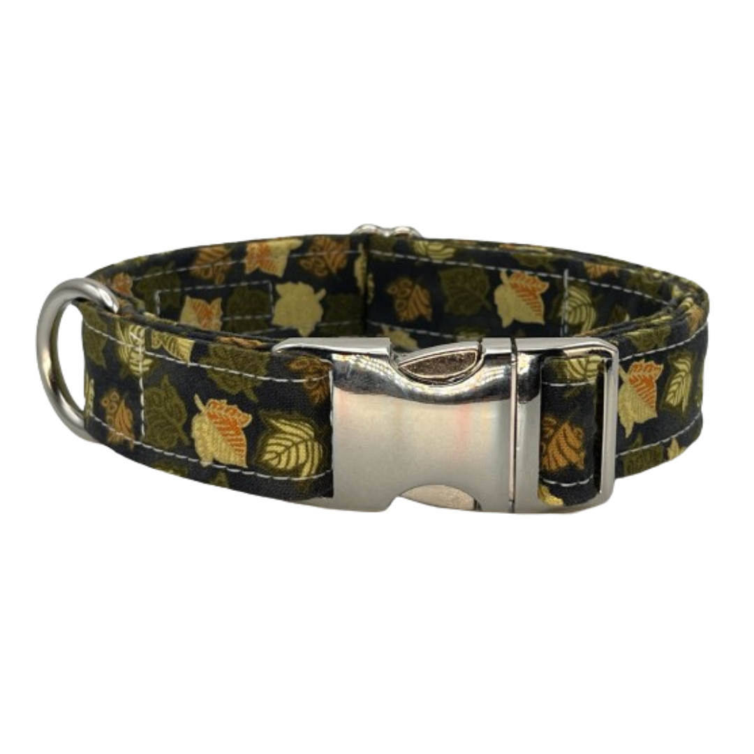 Dog Collar with a dark leafed pattern. Available in Extra Small, Small, Medium, and Large with choice of buckle type. Select size to see pricing.