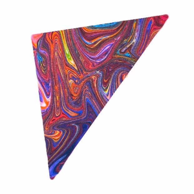 Bandana with a fun, colorful pattern. Comes unfolded so you may adjust to desired size. Available in Small, Medium, and Large. Select size to see pricing.