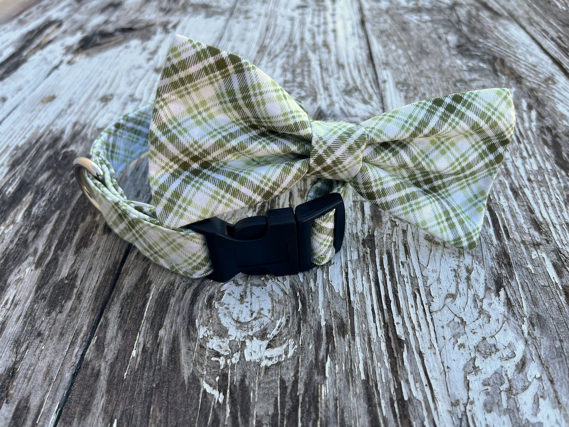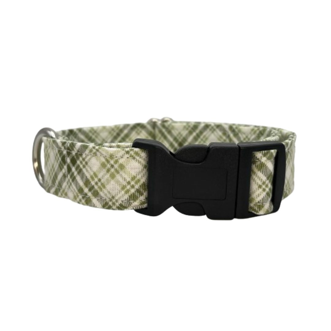 Dog Collar with green plaid pattern. Available in Extra Small, Small, Medium, and Large with choice of buckle type. Select size to see pricing.